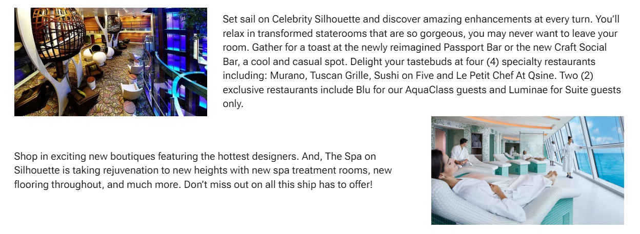 Enjoy the wonders of the Caribbean on the Celebrity Silhouette departing from Fort Lauderdale, Florida in April 2026. You’ll have sea days packed with daytime pool activities, seminars and workshops, meet & greets, clothing-optional pool and open deck areas, plus, afternoon playtime fun. Your port days include stops in Montego Bay, Jamaica and Cozumel, Mexico and will be filled with adventure and exploration. And to top off the days, in the evening you’ll enjoy fine dining and after-dinner drinks with new and old friends, theater shows, musical acts, comedy shows, fun-themed nighttime parties, and late-night playtime fun.