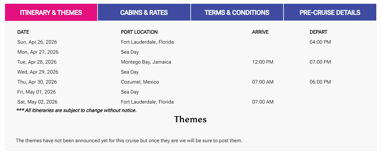 You just can’t have a lifestyle cruise without having a theme for each night! Let your imagination run wild when planning your costumes. It is not required that you dress in theme but it can add some extra fun to the evening! Below is the list of themes for each night so you can start shopping and be prepare when it comes time to pack.